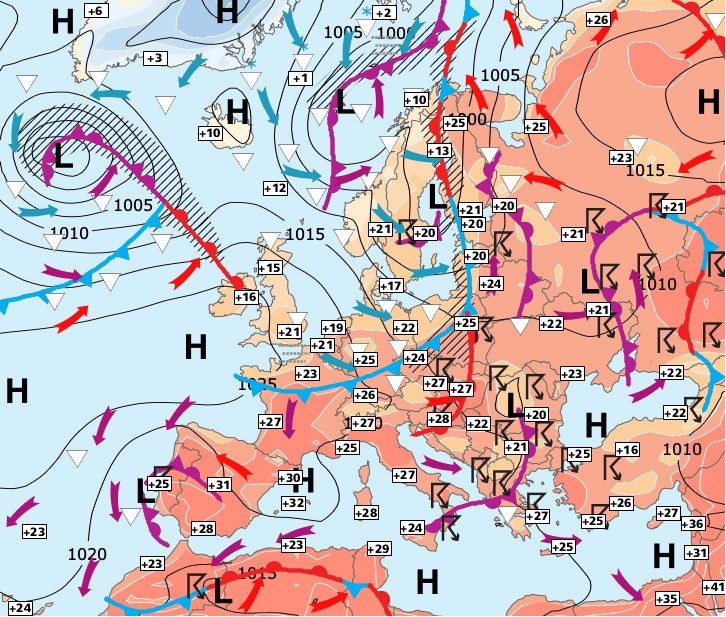 Noms des dépressions et anticyclones prévus pour dimanche 13 juin 2021 à midi (Berlin)
