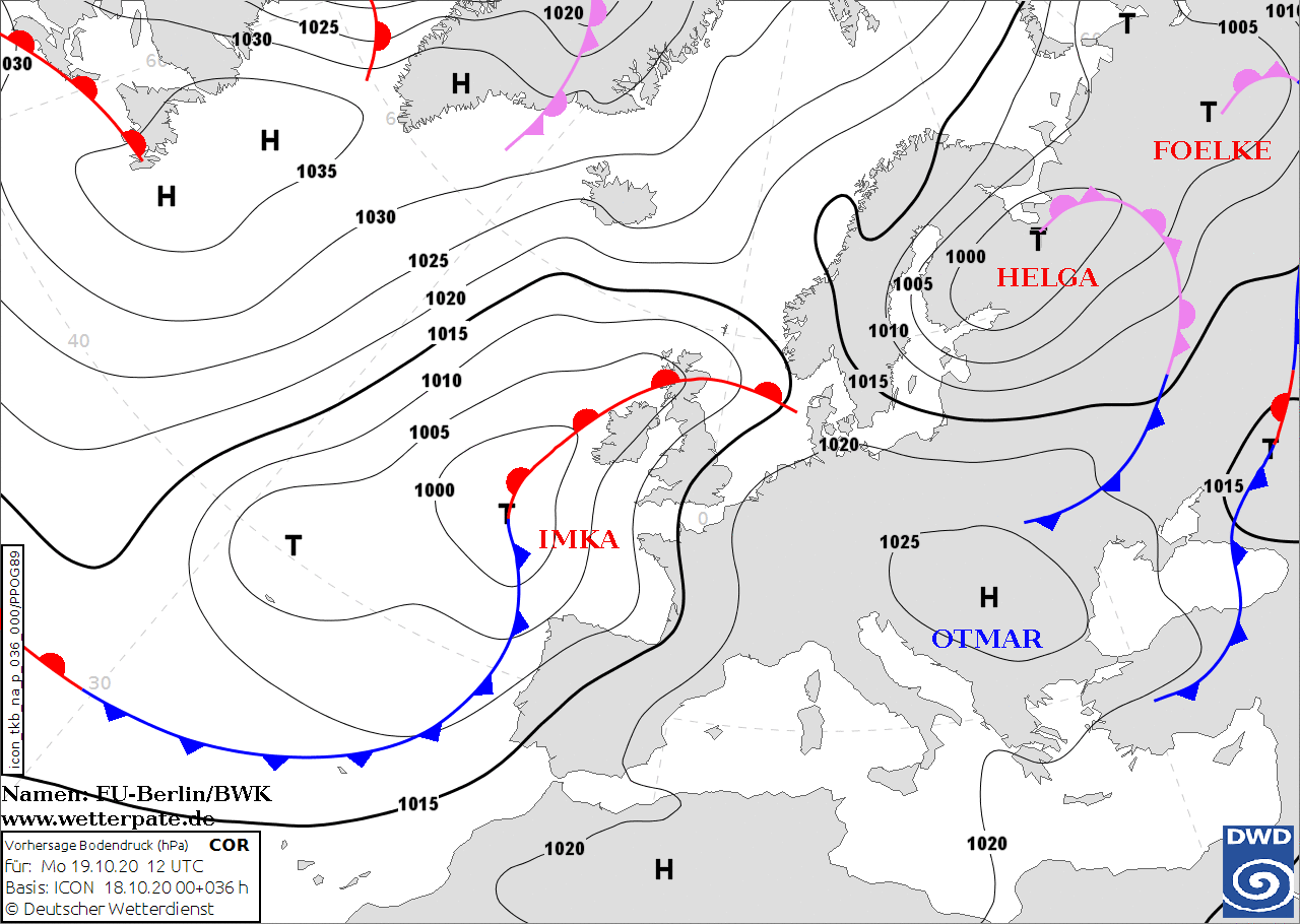 Noms des dépressions et anticyclones prévus pour mardi 20 octobre 2020 à midi (Berlin)