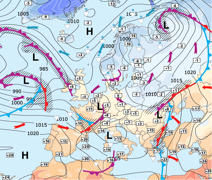 + Vendredi : l’air froid d'Europe du Nord commencera un bras de fer avec l’air très doux qui remontra de Méditerranée - et une zone de précipitations se formera entre l’Aquitaine et le Nord-est.