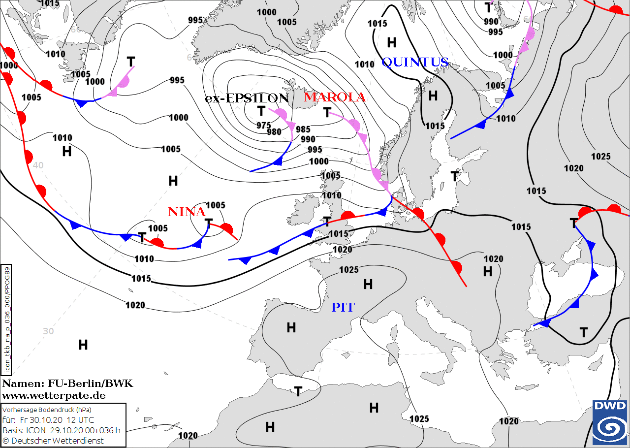 Noms des dépressions et anticyclones prévus pour vendredi 30 octobre 2020 à midi (Berlin)