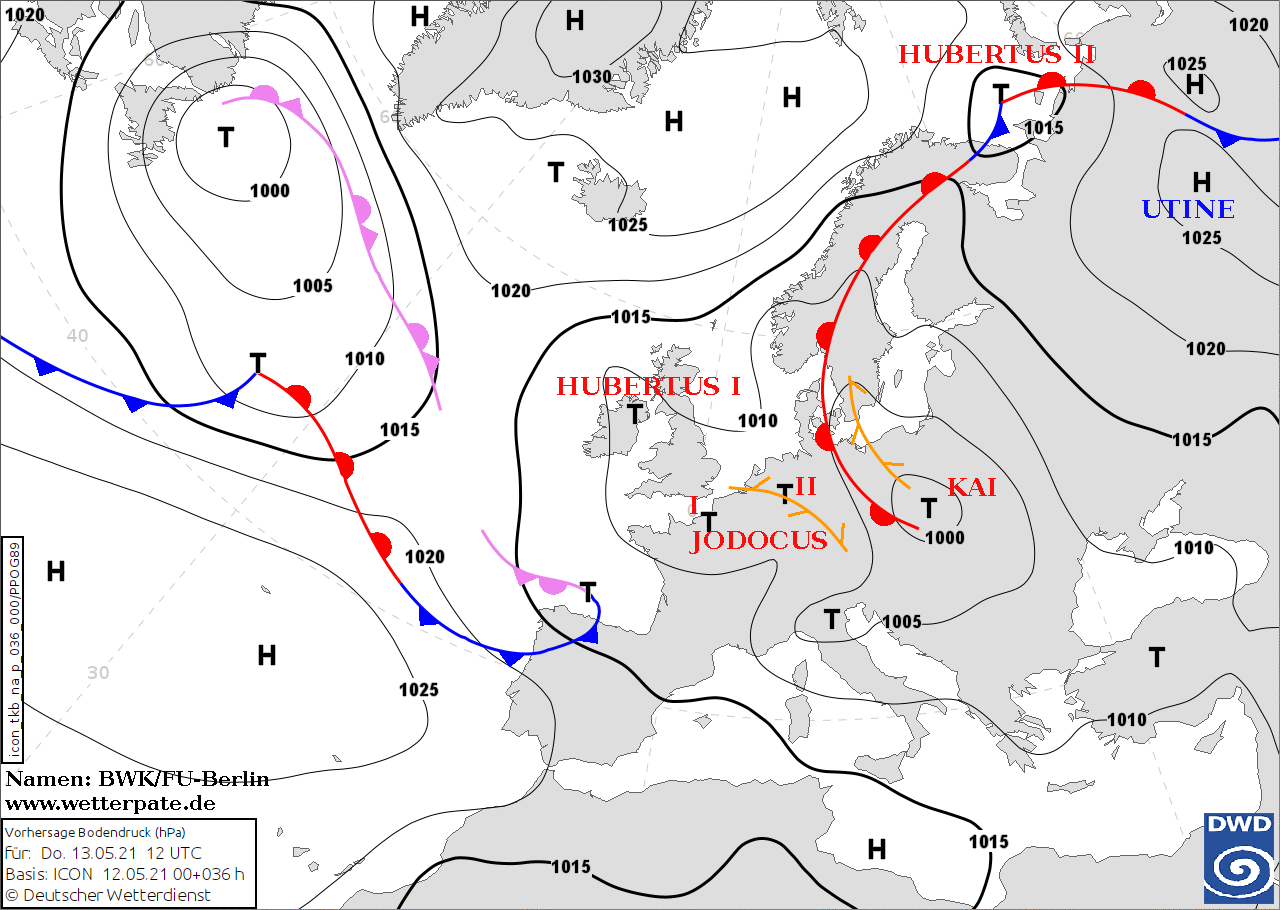 Noms des dépressions et anticyclones prévus pour jeudi 13 mai 2021 à midi (Berlin)
