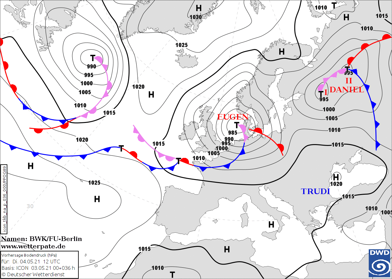 Noms des dépressions et anticyclones prévus pour mardi 4 mai 2021 à midi (Berlin)