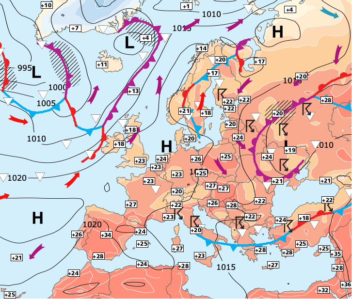 + L’anticyclone des Açores a quasiment rejoint celui de Sibérie. Il protège donc les régions du Nord et de l’ouest de la France où le temps est généralement ensoleillé (les nuages bas ont tout de même du mal à se dissiper sur les côtes de la Manche, influencées par un léger courant océanique).